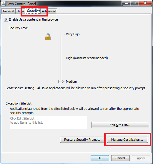 - In the "Java Control Panel" go to the "Security tab"